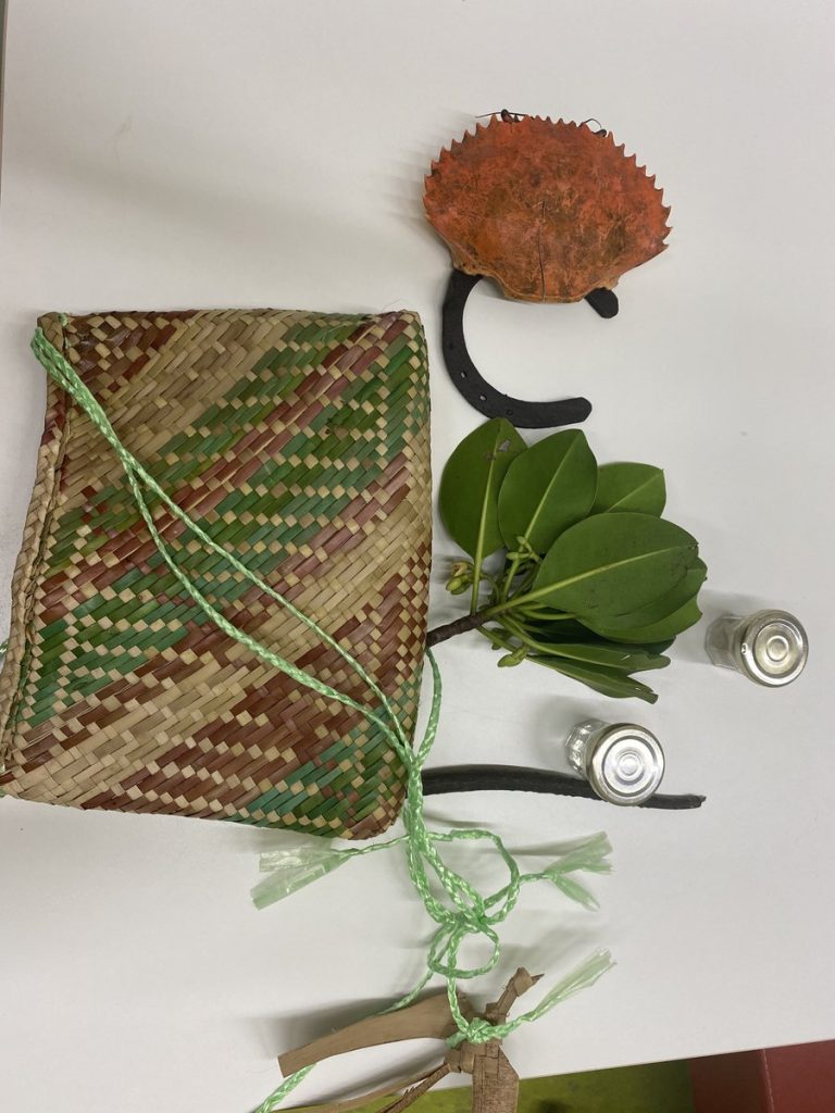 Un sac lui a été offert contenant tout ce qui symbolise OUEGOA : une coquille de crabe, de l’eau du Diahot, une propagule de palétuvier, quelques cailloux, toute l’âme de ce petit village du Nord.